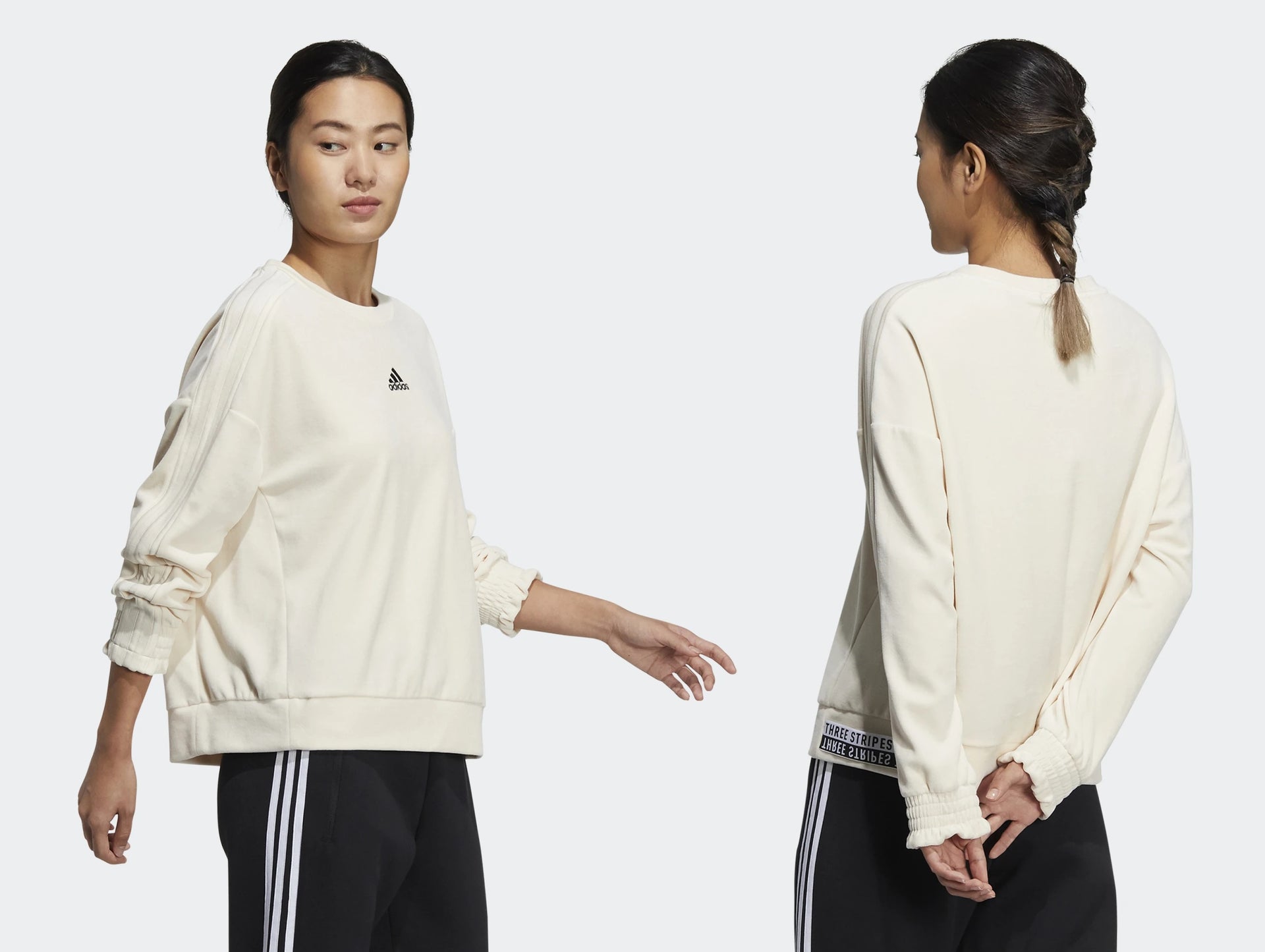 Perhaps tied with the feeling of accomplishment after showing up for yourself, is the feeling of sweet comfort that comes with trading out your sweaty gym clothes for something fresh. Like this adidas crew sweatshirt. That it's made of soft, luxe velour only heightens comfort. Elastic and ribbed details keep it feeling snug, so you can really settle in.