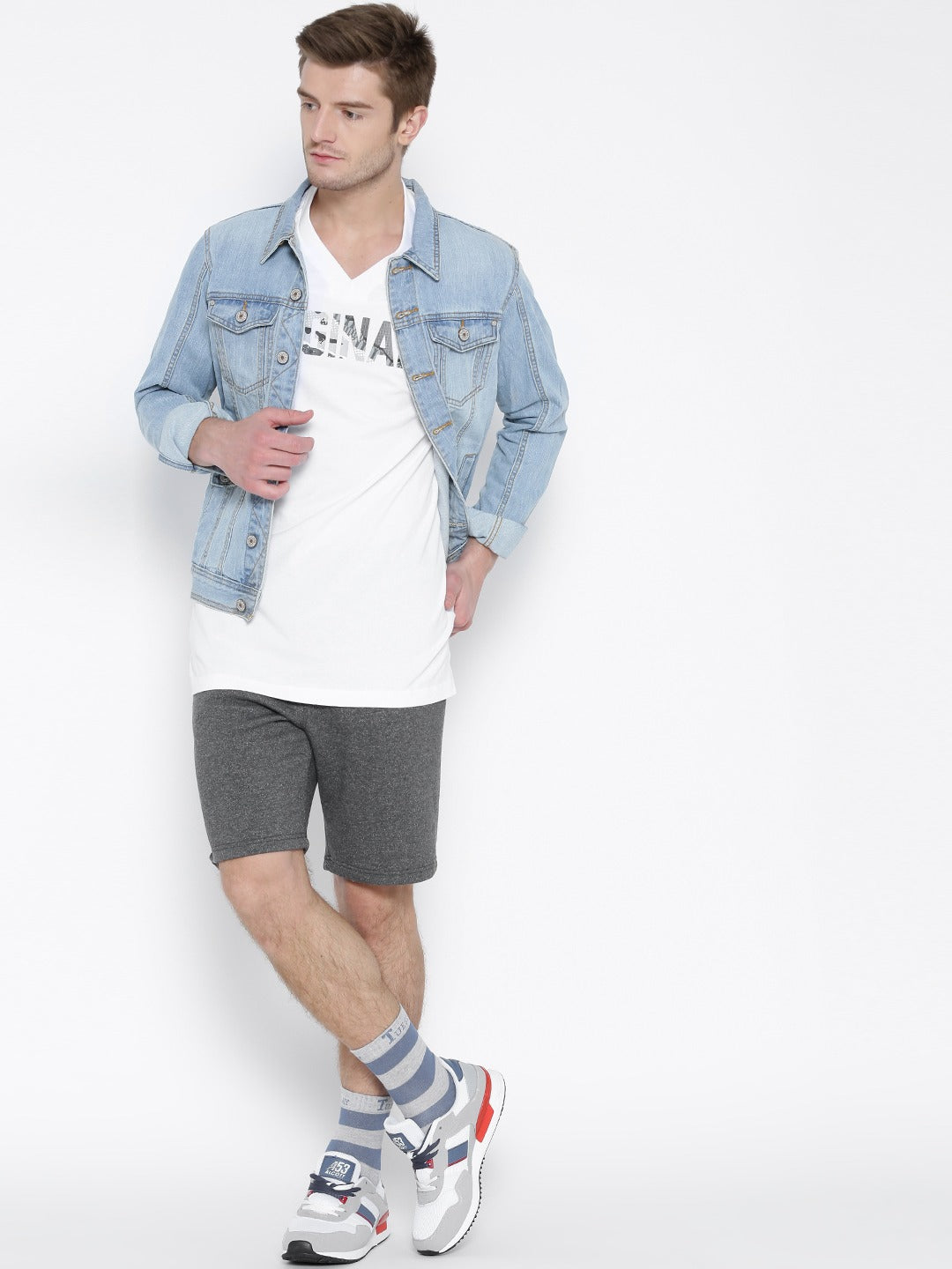 White printed T-shirt, has a V-neck, short sleeves