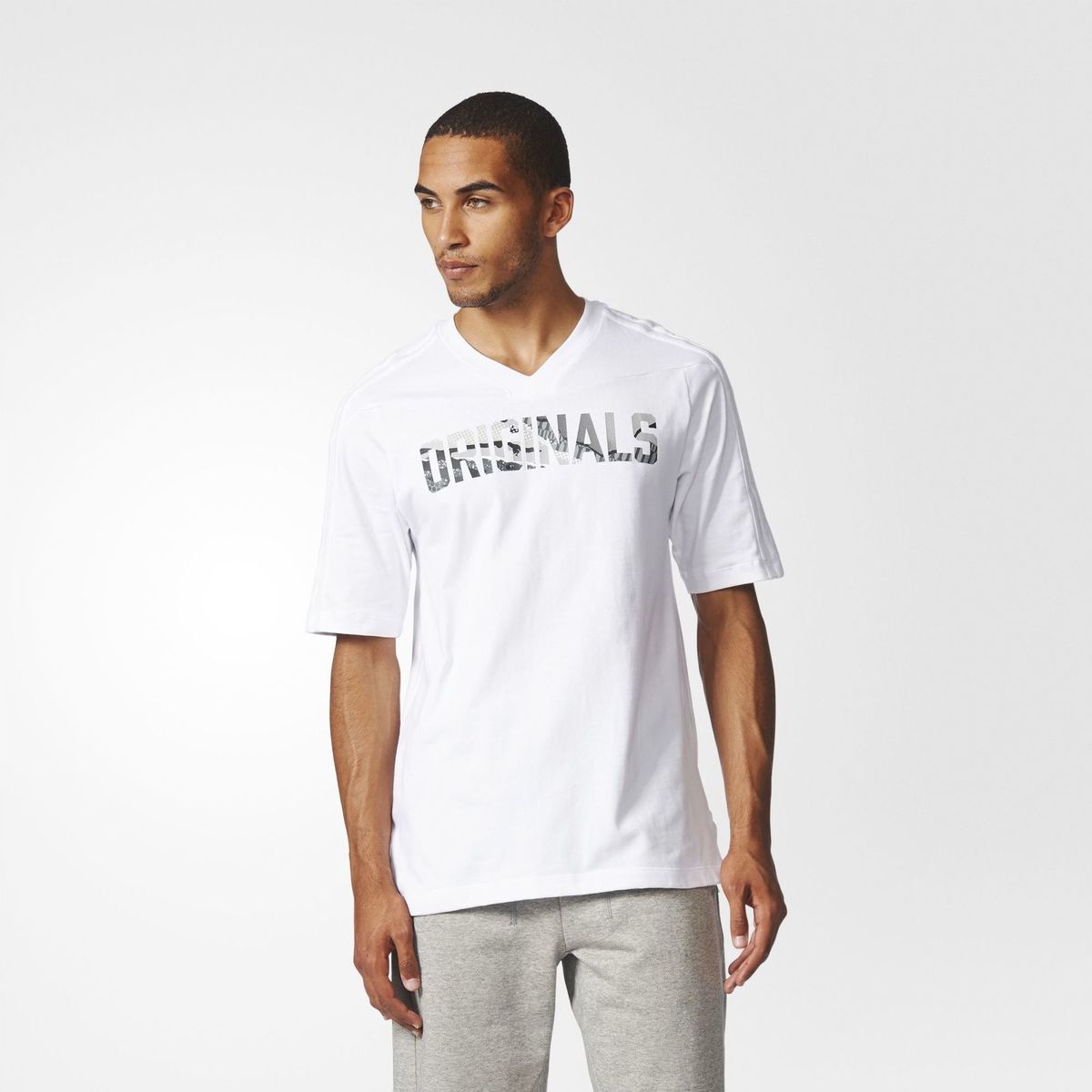 The playful style of LA continues to inspire adidas Originals. So do archival sport designs. Sometimes, two inspirations merge, creating a fresh streetwear look. Riffing on a basketball jersey, this men's V-neck t-shirt flashes the word "Originals" across the chest. The bold letters are filled with a print celebrating Southern California. Finishing on a heritage note, tonal 3-Stripes ride the sleeves, while a long cut adds a modern twist.