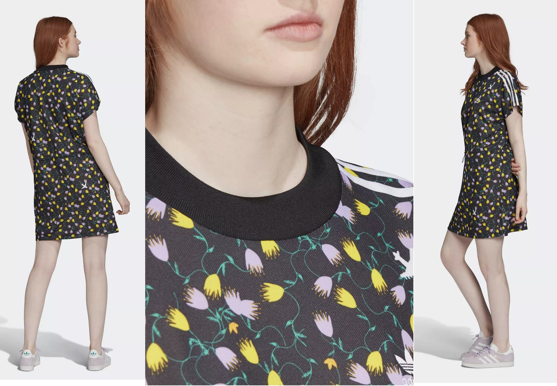 A smooth floral dress that hangs casually on the body.