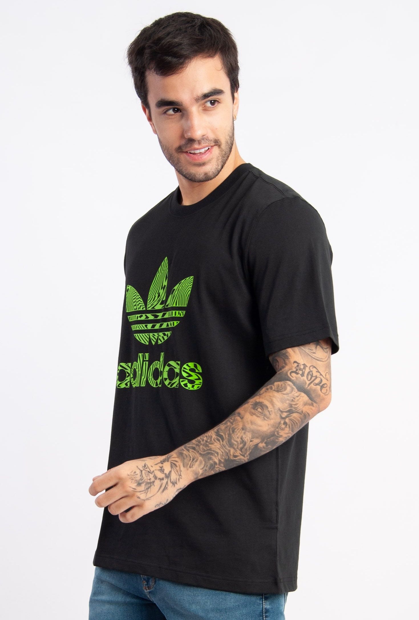 T-shirt made of cotton jersey.  It features a rounded collar with ribbed trim, short sleeves, the brand's trefoil logo applied to the front, and topstitched finishing.